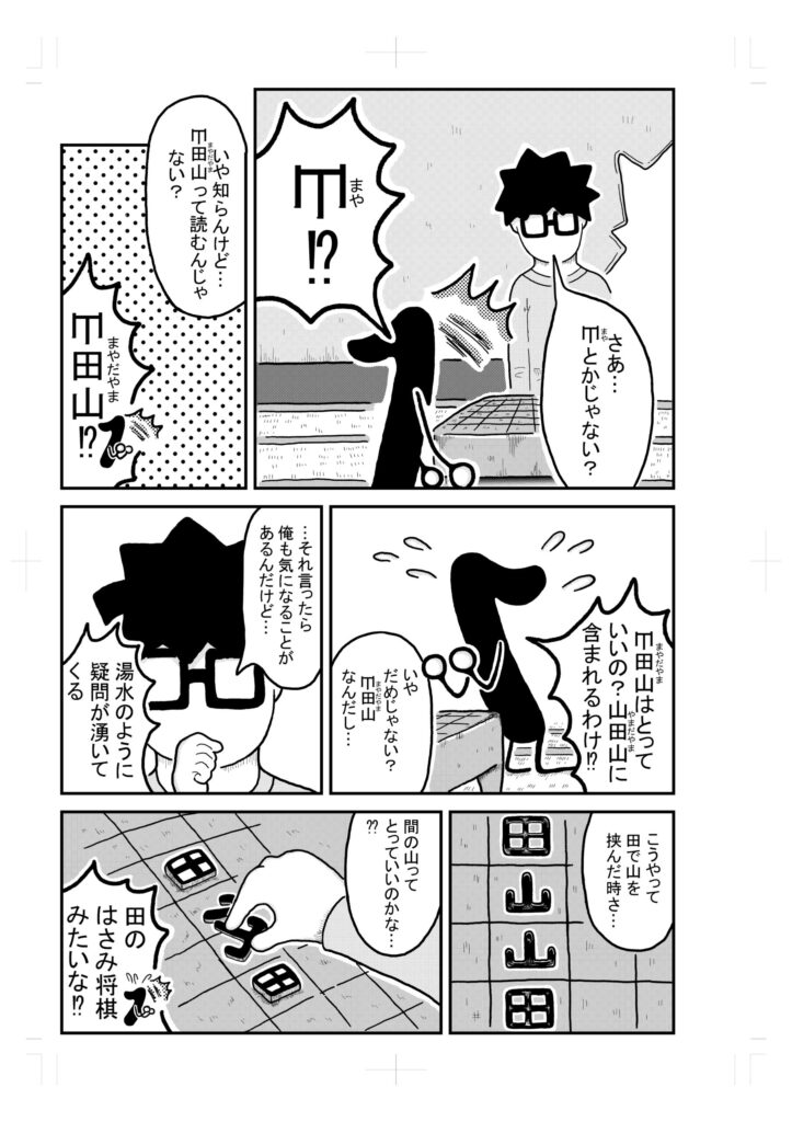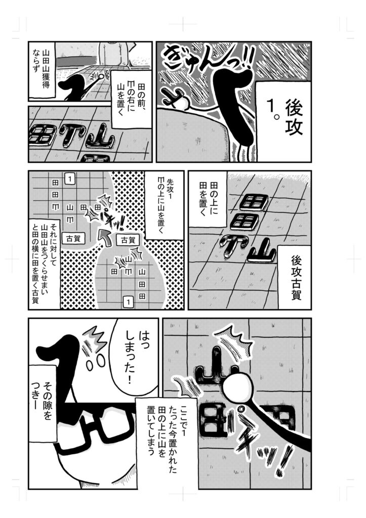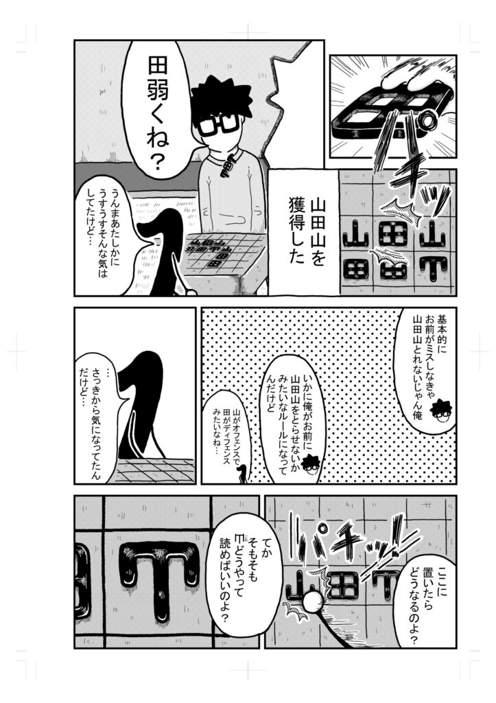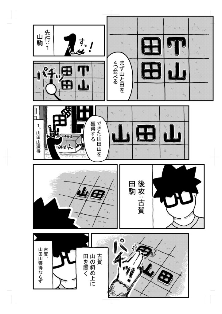 うーんとまず山と田を4つ並べて、山を田の横に置くと山田山ができるので、それを獲得した後に山田の左斜めに田を置く展開かぁ。なるほどなぁ。