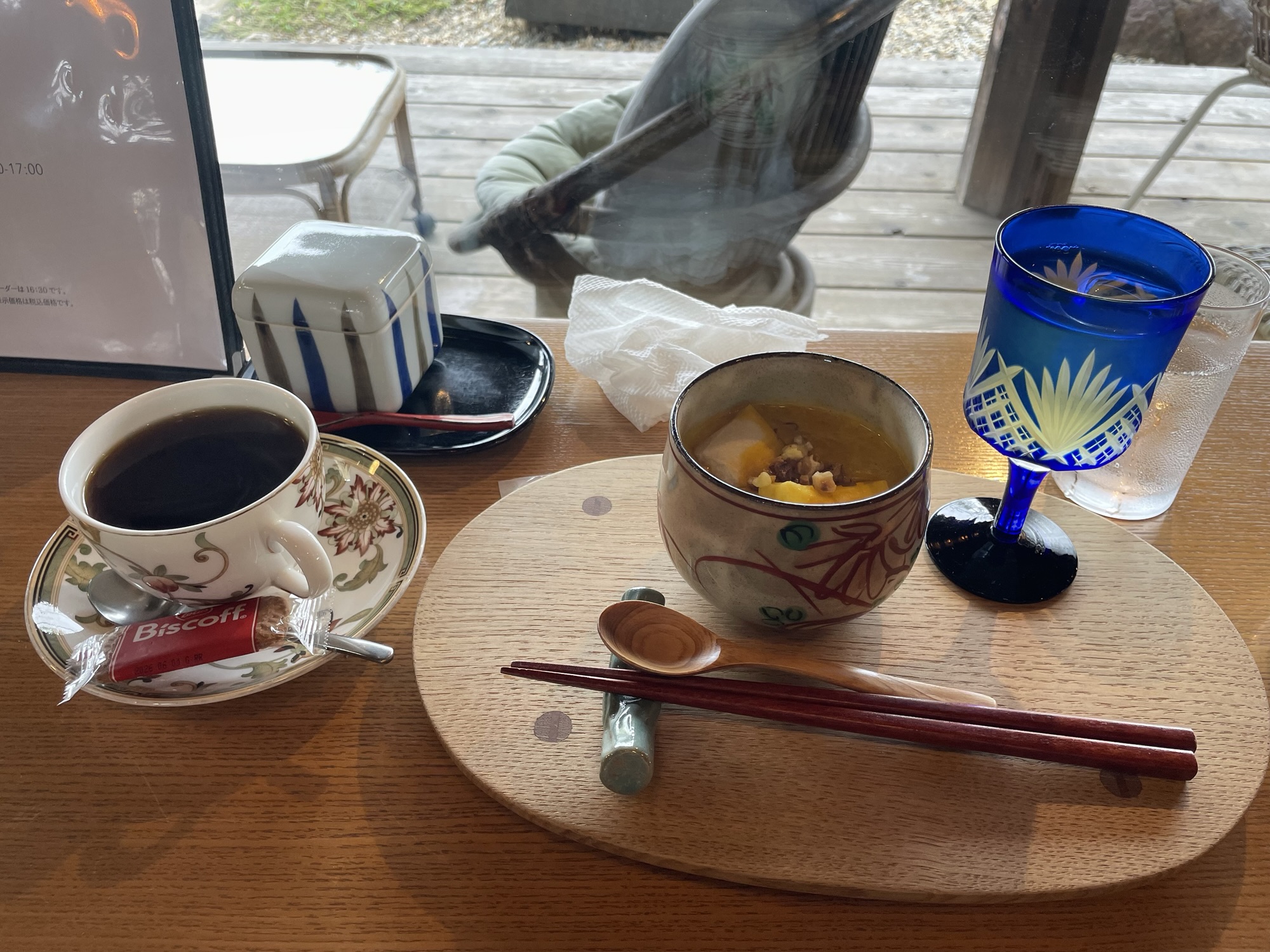 かぼちゃぜんざい、ホットコーヒー、緑茶をどう味わうかを楽しむ間、眼前には庭が広がる。During the time which I taste pumpkin Zenzai and hotcoffee,Japanese tea,the garden is spread in front of my eyes.