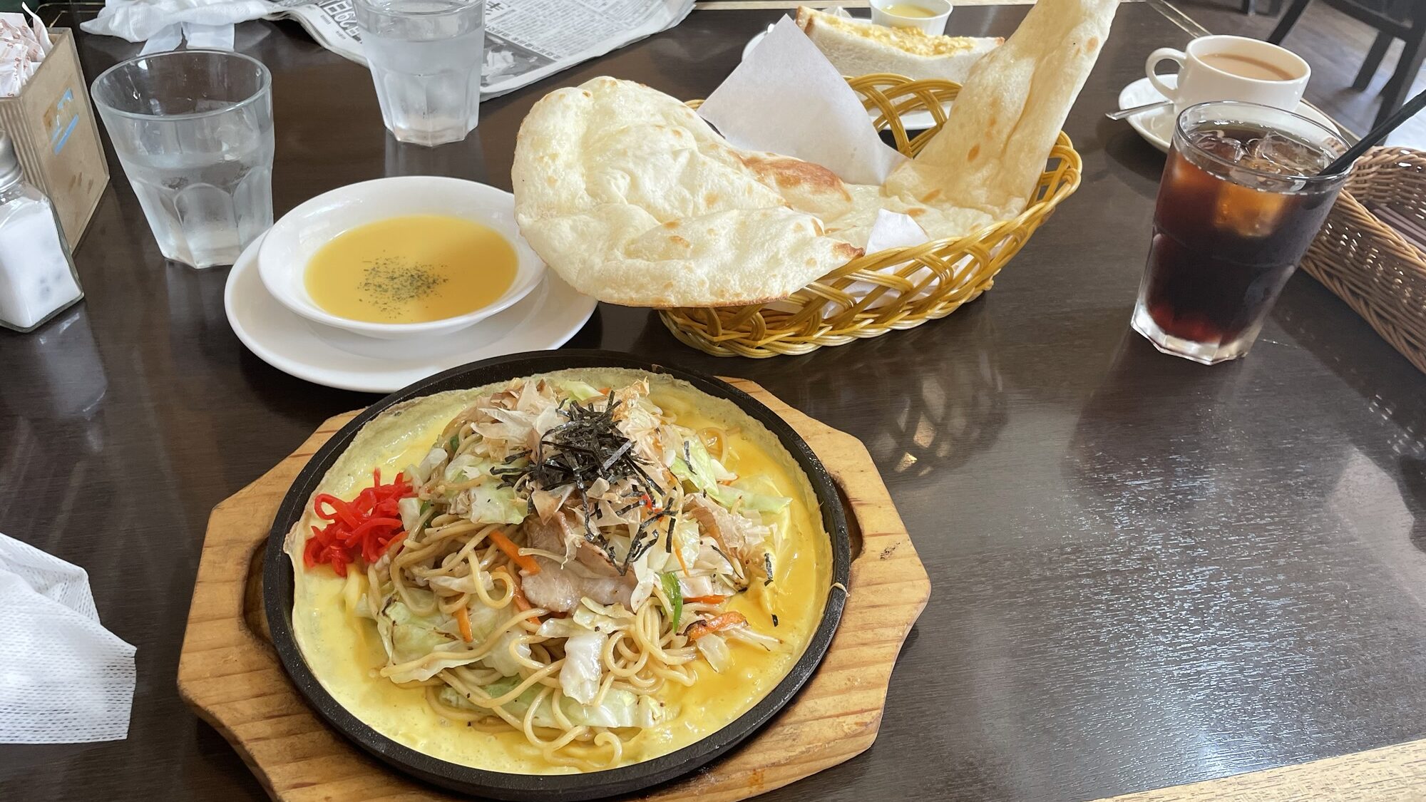 塩焼きそばとナンとコーンポタージュとアイスコーヒーが同時に出てくる。